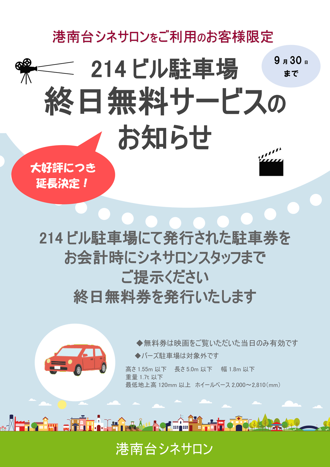 港南台シネサロンをご利用のお客様限定/214 ビル駐車場 終日無料サービス 7/4(金)~9/30(火)