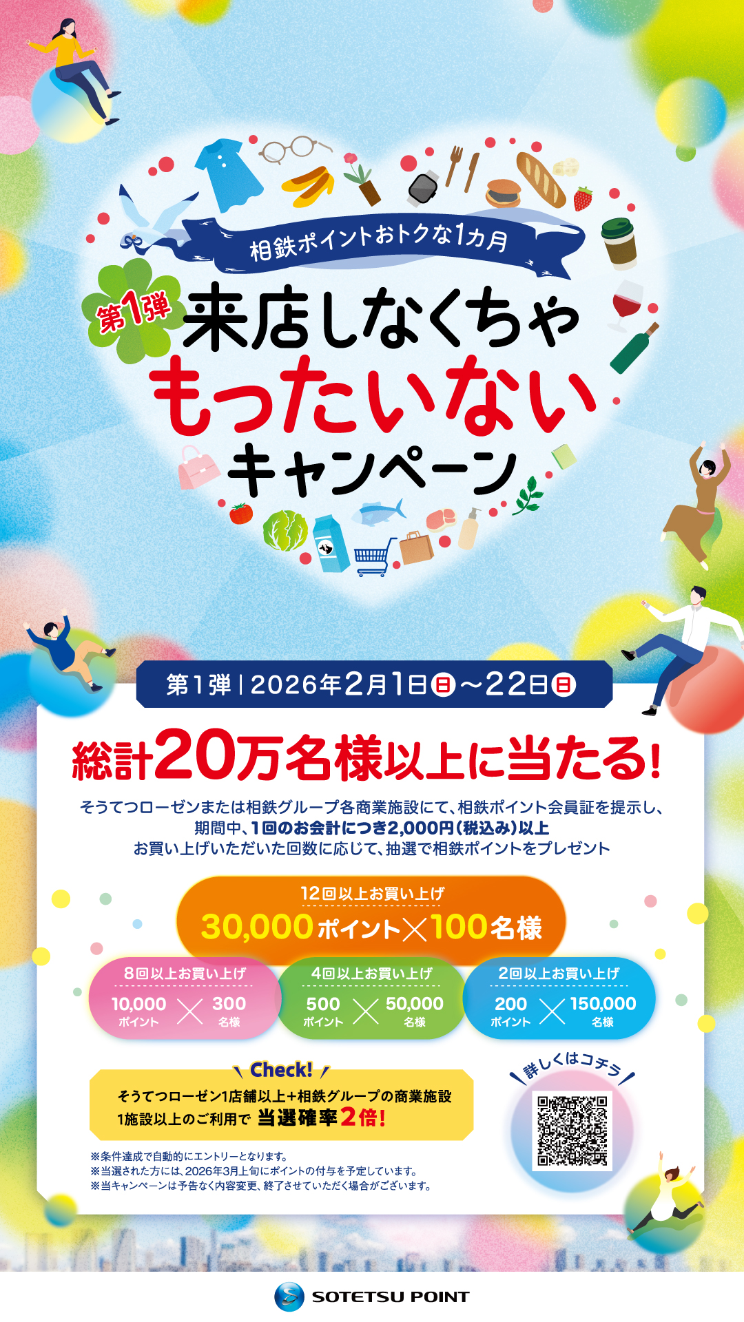 キャンペーン期間中、そうてつローゼンまたは相鉄グループの商業施設にて相鉄ポイント会員証を提示し、1回のお会計につき2,000円(税込み)以上お買い上げされた回数に応じて、抽選で相鉄ポイントをプレゼントします。