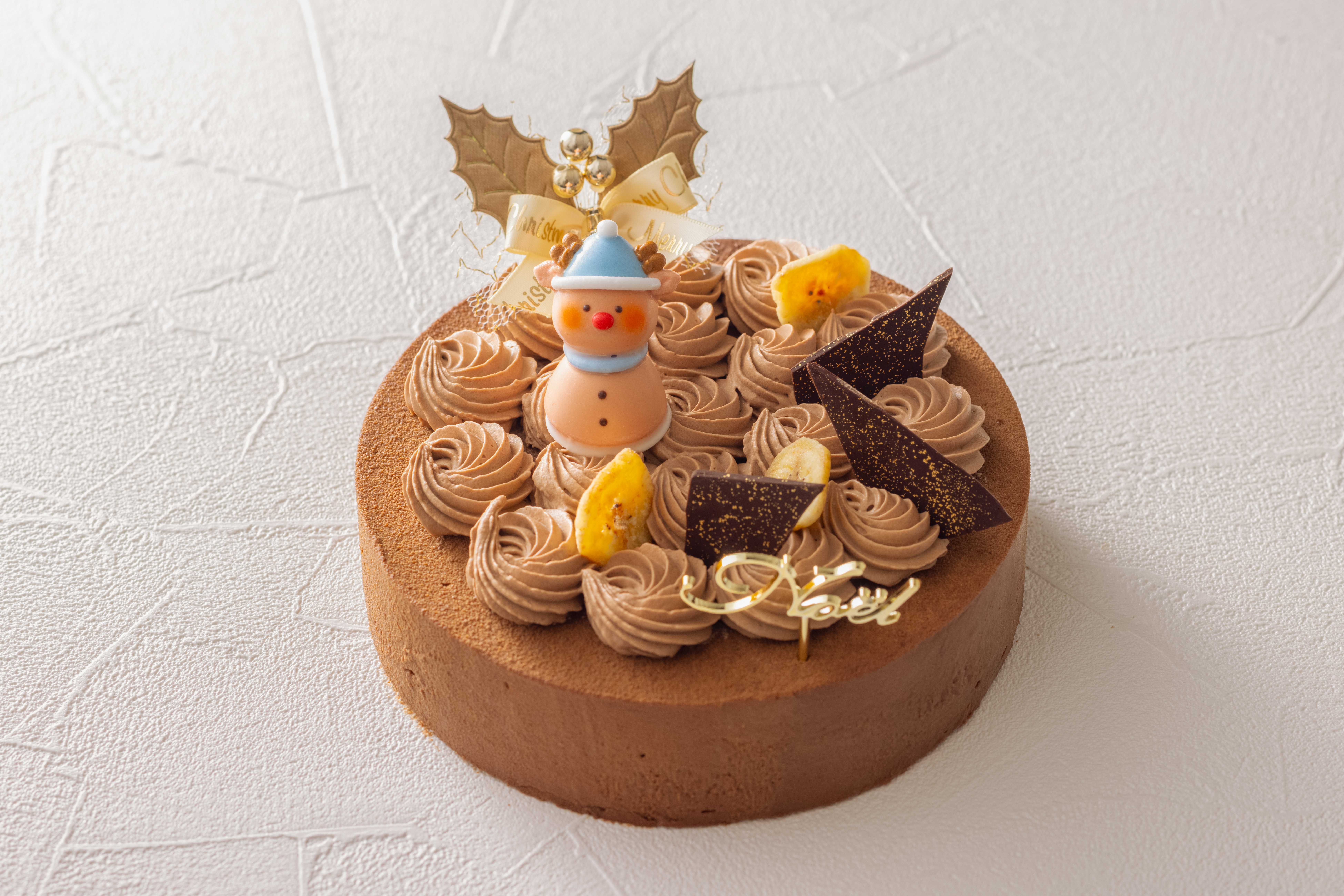 濃厚なチョコレートムースになめらかなバニラクリームとキャラメリゼしたバナナが入ったケーキ。